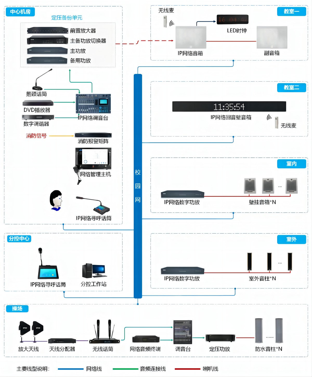 嚴(yán)格按照學(xué)校要求,結(jié)合學(xué)校的建筑結(jié)構(gòu)及相關(guān)設(shè)計(jì)標(biāo)準(zhǔn)進(jìn)行規(guī)范設(shè)計(jì),融合“日常廣播、教學(xué)廣播、管理廣播、分控廣播、教室擴(kuò)聲、操場(chǎng)擴(kuò)聲、雙向?qū)χv、信息發(fā)布”等功能于一體的綜合性校園廣播系統(tǒng),集成了定時(shí)自動(dòng)打鈴、教室多媒體擴(kuò)聲、教學(xué)擴(kuò)聲、雙向可視對(duì)講、多級(jí)分控管理、音頻實(shí)時(shí)采播等國(guó)際先進(jìn)多媒體技術(shù)在教育教學(xué)中的最新應(yīng)用。