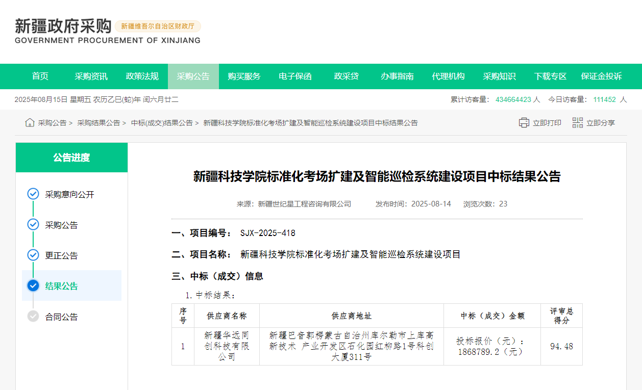 2025年8月14日,新疆政府采購網(wǎng)發(fā)布中標(biāo)公告,新疆華遠(yuǎn)同創(chuàng)科技有限公司憑借雄厚的綜合實(shí)力,以94.48分的佳績成功中標(biāo)新疆科技學(xué)院標(biāo)準(zhǔn)化考場擴(kuò)建及智能巡檢系統(tǒng)建設(shè)項(xiàng)目,在教育信息化領(lǐng)域再添里程碑項(xiàng)目。